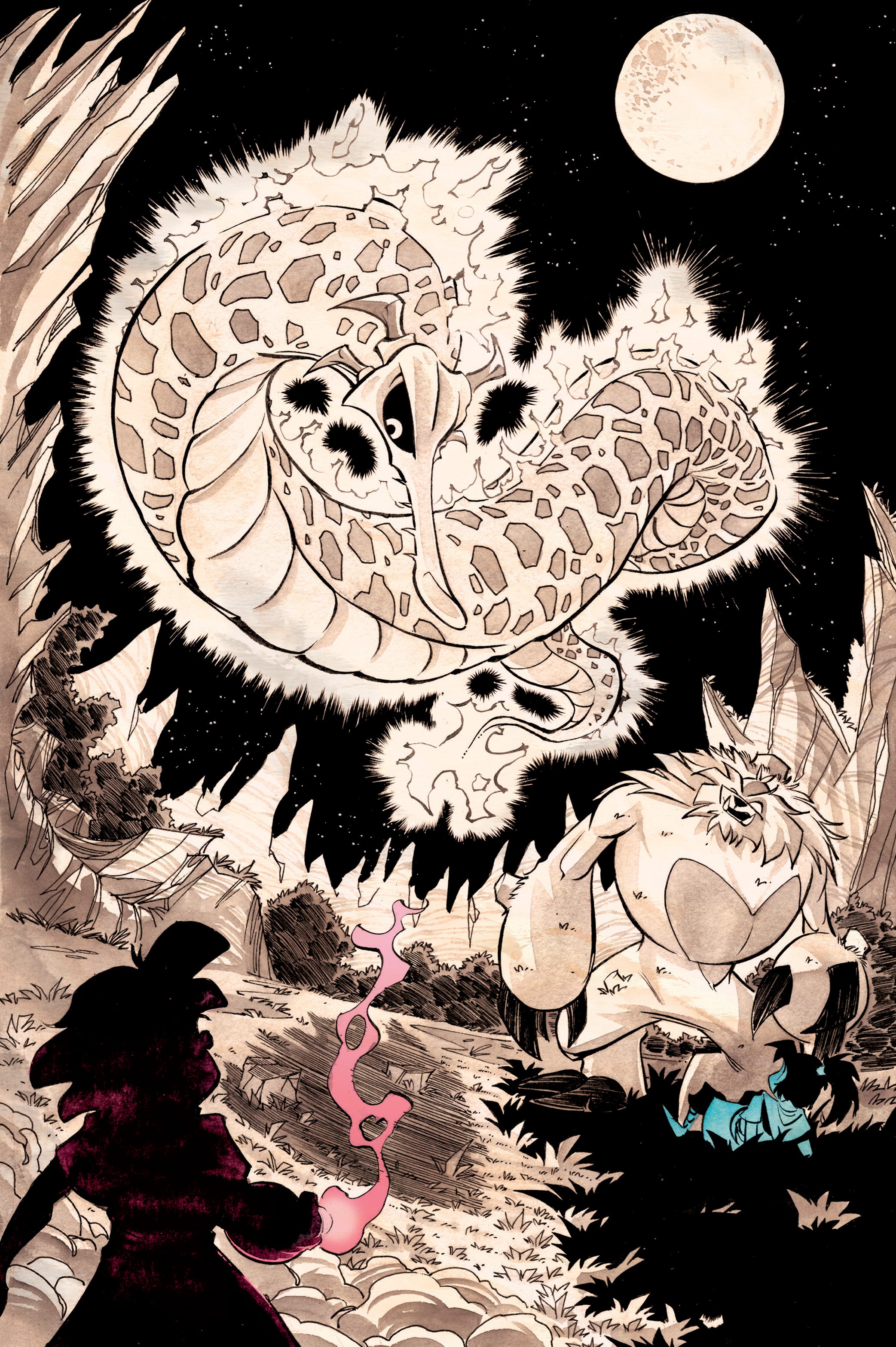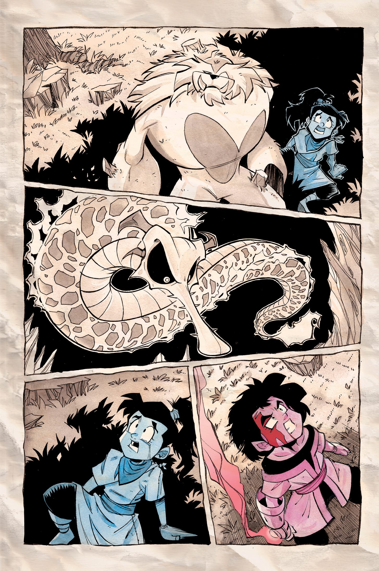 So I’ve added this page to help let the scene catch its breath! It’s a splash page showing an up-close and personal shot of one of the monsters from the book. It’s (hopefully) impactful and effective.