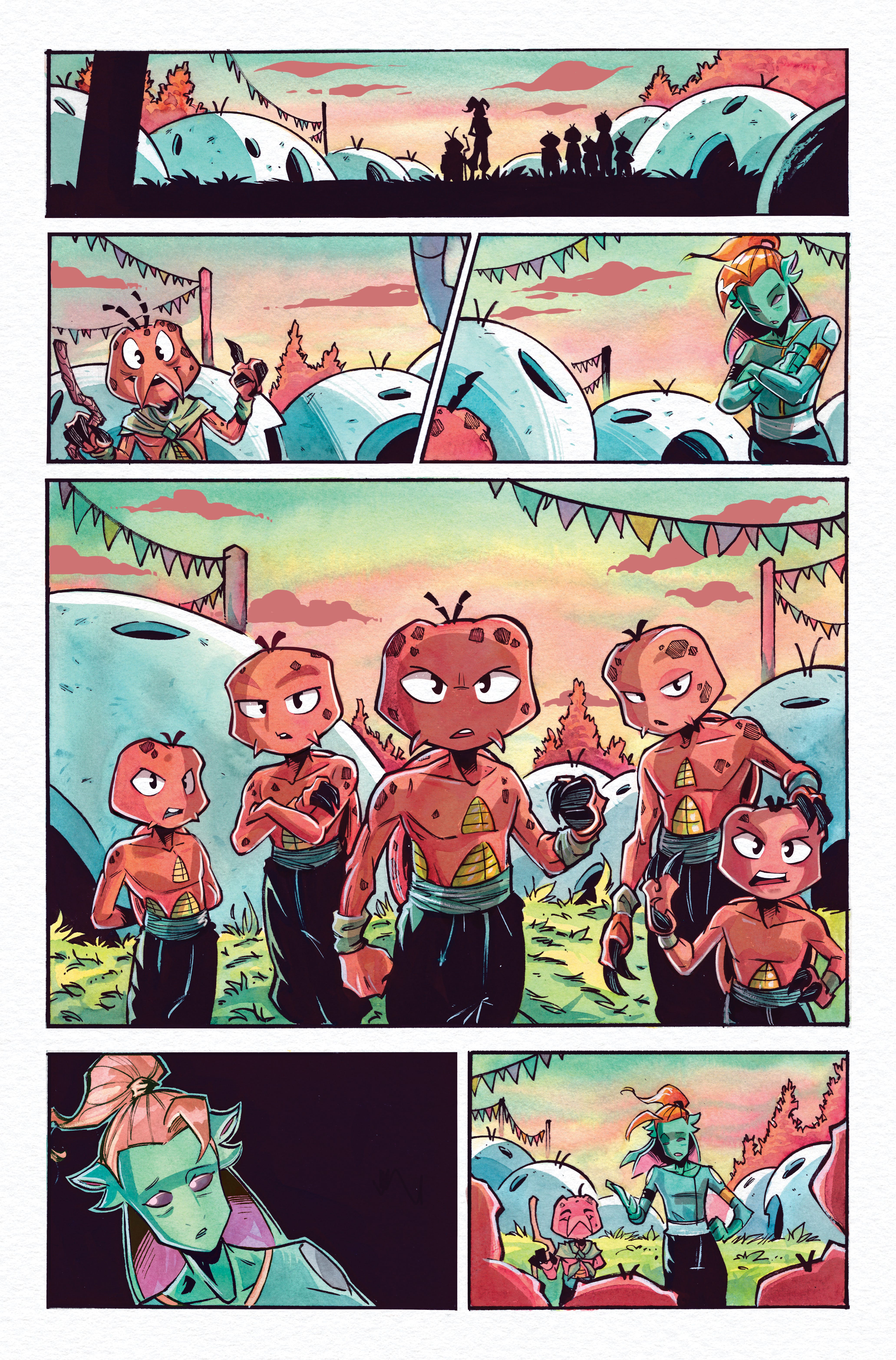 No dialogue, just two monsters having a stare down while two girls watch on in horror and suspense. It lets the scene breathe, and lets the reader catch their own breath before the maelstrom of action on the subsequent pages. Mission accomplished, and it didn’t add anything unnecessary!