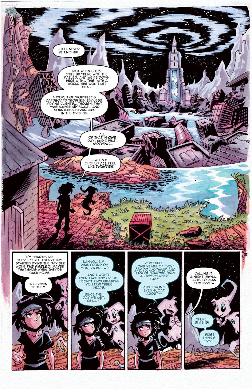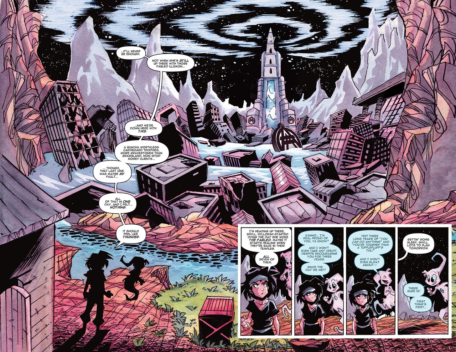 First, I took the first large panel of the ruined city and spread it across a two page spread. This created some empty space on the right side of the page, though. I had to digitally recreate some of the artwork by compositing a background using the already-existing art. All of the rocks on the right side of the page are made from the rocks on the left side of the page.